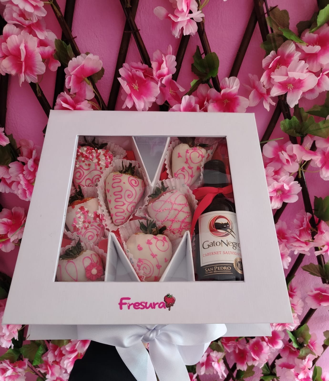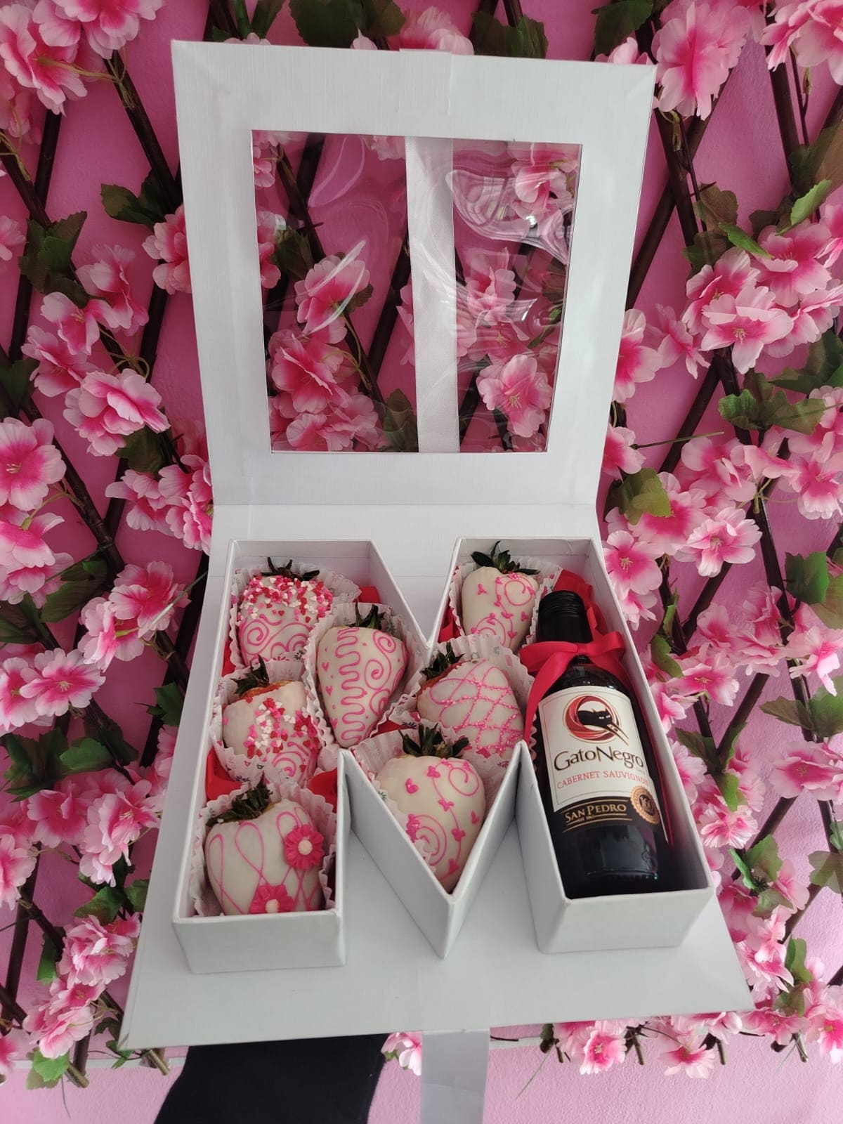 Delicada caja en forma de la letra M con ventana tipo libro, incluye fresas con chocolate personalizadas y un mini vino tinto. Es un regalo ideal para mamá o una personita especial con esta inicial.