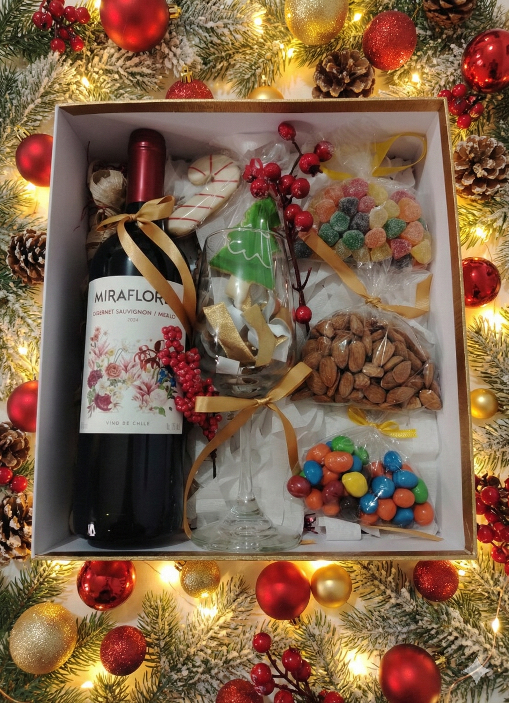 La caja contiene un vino Miraflores + copa de vino + pack de frutos secos, chocolates, gomitas frutales + galleta navideña