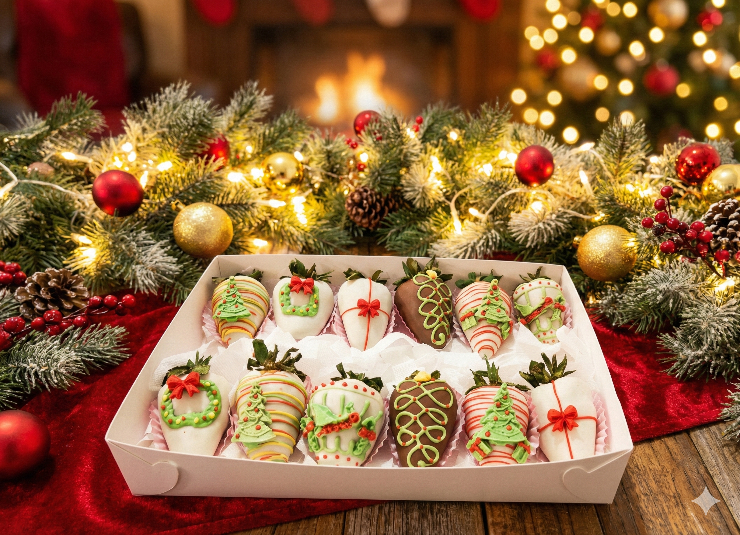 Nuestra caja de 12 Fresas con Chocolate es la manera más deliciosa de celebrar estas fiestas. Cada fresa está decorada artesanalmente con motivos Navideños (árboles, muñecos de nieve, bastones de caramelo).