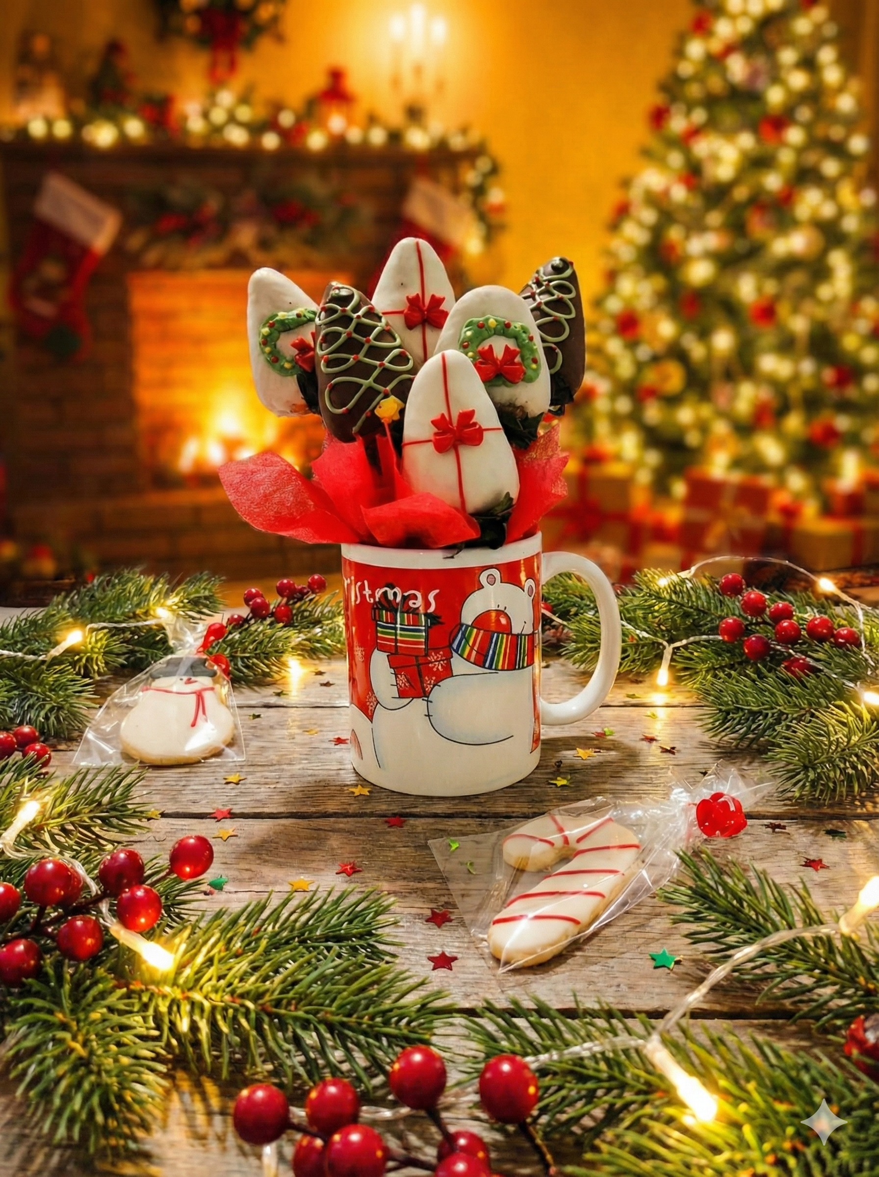 Taza de Navidad ideales para detalles corporativos. Contiene seis fresas frescas cubiertas de chocolate, con diseño temático festiva navidad.
